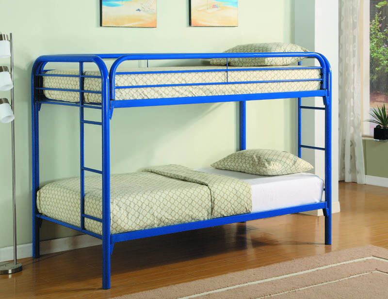 The fun space saving design of this twin bunk bed will make a wonderful addition to your bedroom. Built-in ladders on each side offer convenience, while full length guard rails provide security. Strong 2-inch metal tubing.
