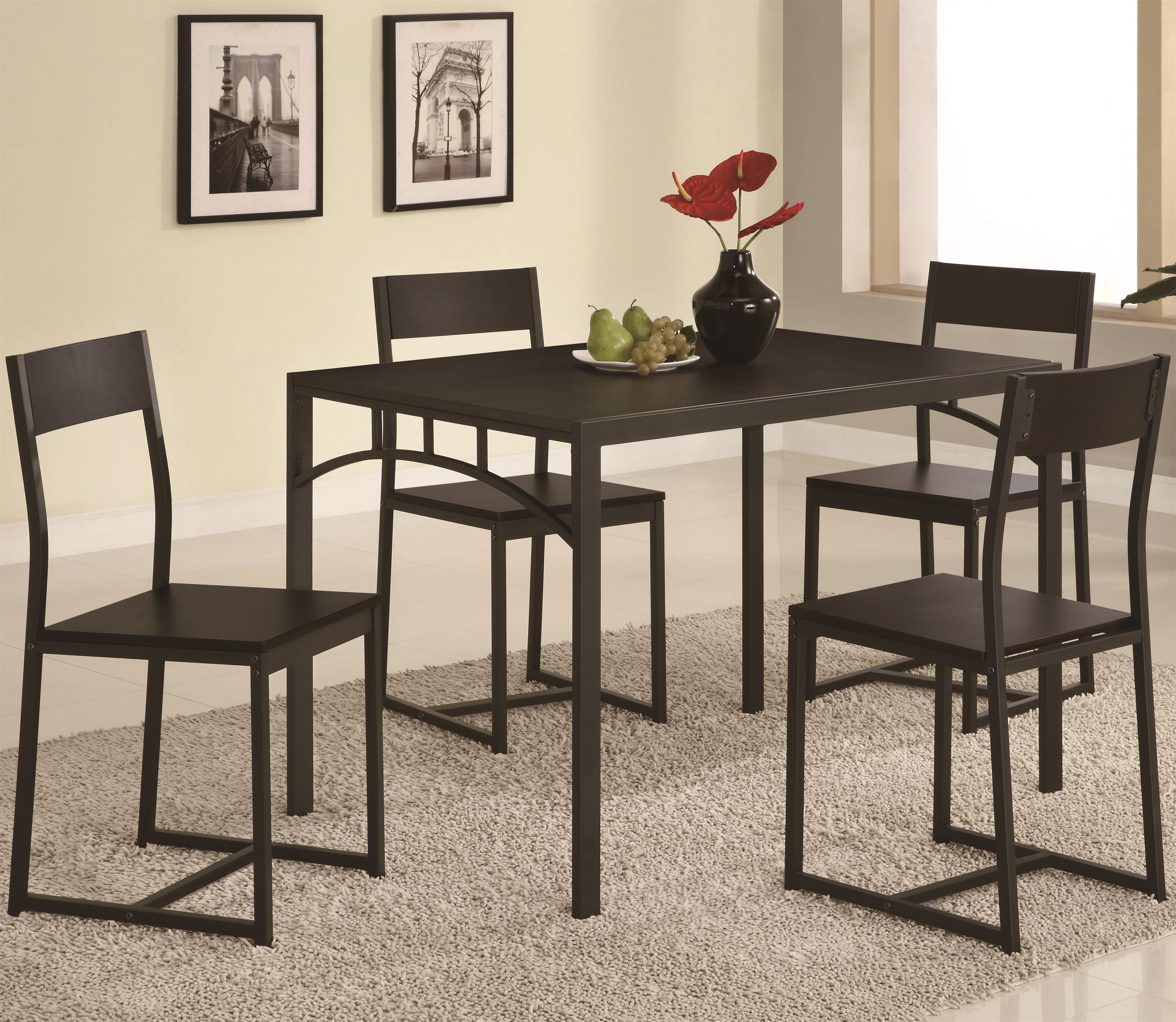 Simple black 5pc dinette. It is crafted with a deep cappuccino finish, giving it a modern look and feel. It is ideal for smaller size rooms. The table features clean lines and sleek straight legs for a streamlined design. The four matching side chairs echo this styling, while also offering subtly curved backs for added visual dimension.